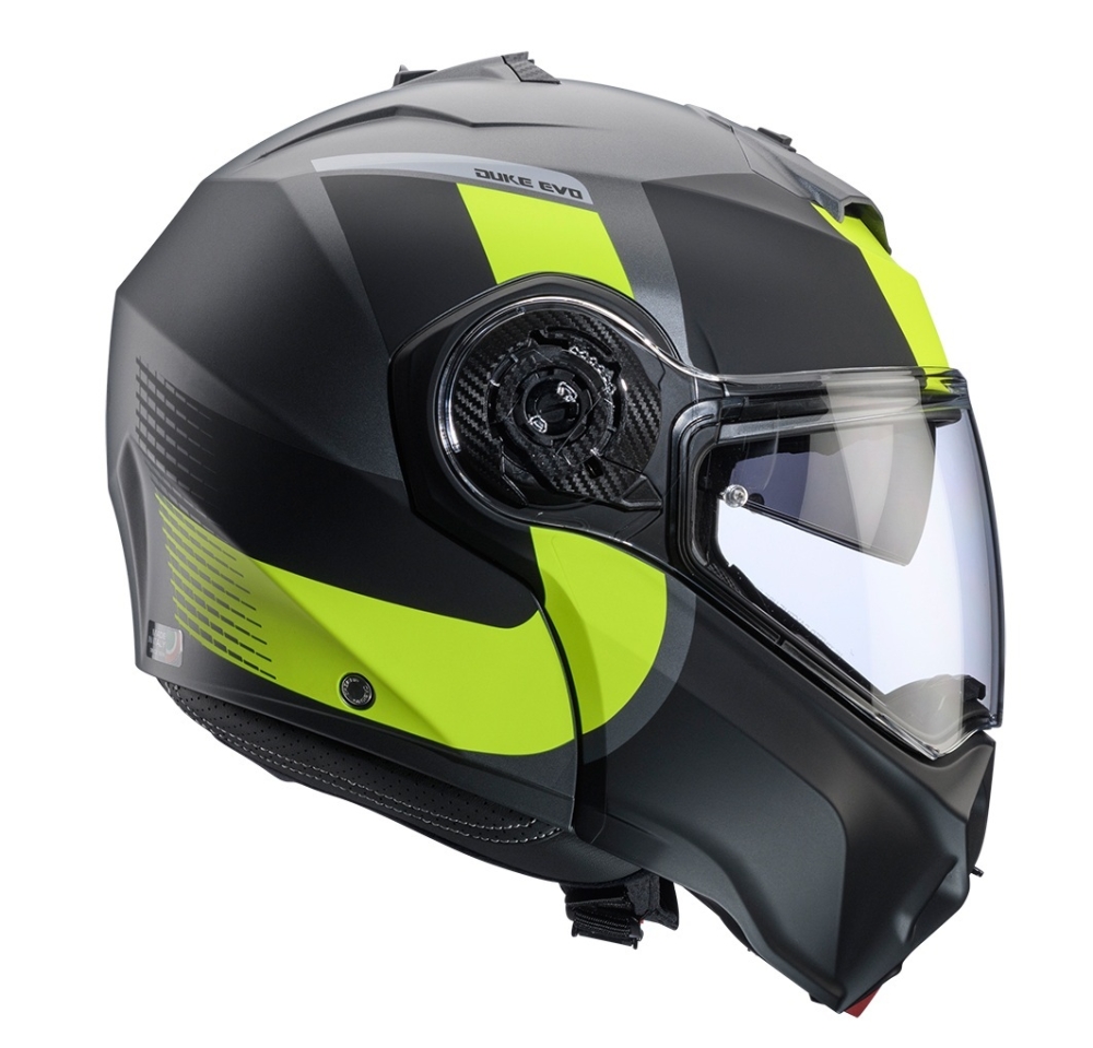 • Duke Evo SV este omologata ECE 22.06, cu omologarea dubla “P/J” care permite folosirea in siguranta a castii si cu mandibula ridicata, datorita sistemului de blocarea a mandibulei “P/J”, localizata stanga a castii;
