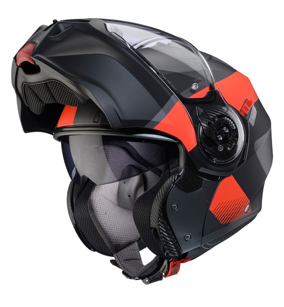- interiorul este fabricat din materiale premium, antialergice, de o calitate net superioara, comparativ cu modelul precedent Duke; buretii de la obraji au fost dezvoltati prin tehnologia 3D, cu scopul de a asigura o fixare cat mai fidela a castii la purtarea ei, atat inchisa, cat si cu madibula deschisa (rabatata);