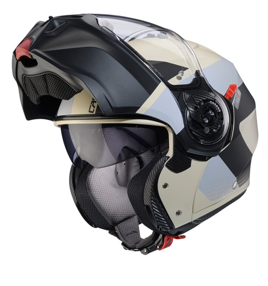 - interiorul este fabricat din materiale premium, antialergice, de o calitate net superioara, comparativ cu modelul precedent Duke; buretii de la obraji au fost dezvoltati prin tehnologia 3D, cu scopul de a asigura o fixare cat mai fidela a castii la purtarea ei, atat inchisa, cat si cu madibula deschisa (rabatata);