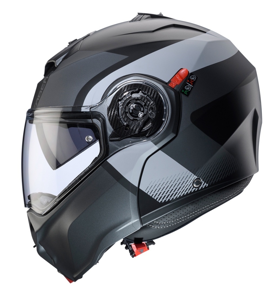 • Duke Evo SV este omologata ECE 22.06, cu omologarea dubla “P/J” care permite folosirea in siguranta a castii si cu mandibula ridicata, datorita sistemului de blocarea a mandibulei “P/J”, localizata stanga a castii;