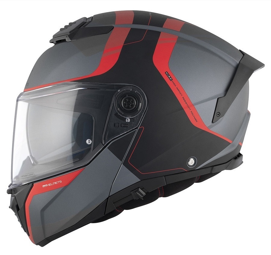 Casca modulabila MT Atom 2 SV Emalla B15 gri/rosu mat (ochelari soare integrati) Pinlock Ready - tip viziera: MT-V-35 Descriere: • noul model Atom 2 SV este casca flip-up cu ochelari de soare integrati omologata pe noul standard european de siguranta ECE 22.06; • punctaj SHARP Test – 4/5 stele; - este un model de casca touring-adventure (dar care poate fi utilizata cu brio si in deplasarile urbane), care incorporeaza noul mecanism de viziera tip MT-QVSS, un sistem patentat de MT si care permite shimbarea extrem de rapida a vizierei; - ca rezumat, noul model Atom 2 SV este cea mai buna alegere din portofoliul MT, din categoria castilor modulabile (flip-up), ca raport pret-calitate. Caracteristici: • omologare ECE 22.06 - casca Atom 2 SV indeplineste cele mai ridicate standarde de siguranta europene; • MT-QVSS - Quick Visor Swap System - sistem proiectat intern de echipa de ingineri MT si echipat in premiera pe  o casca modulabila (flip-up) din gama producatorului spaniol MT; • mecanismul MT-QVSS este patentat de MT si permite utilizatorului sa ataseze sau detaseze viziera foarte rapid si confortabil, fara a da casca jos din cap; • HIRP - calota noii casti Atom 2 SV este produsa dintr-o combinatie de polimer denumita HIRP (High Impact Resistant Polymer). Aceasta formula are rezultate superioare la testele de impact; • MT-RADD - Reduced Aero Drag Design - inginerii de la MT Helmets au reusit, prin aerodinamica acestei casti, sa reduca rezistenta aerodinamica in timpul rularii, pentru a spori confortul riderului; • MT-AFCS - Air Flow Channel System - prizele de aer ale acestui model au fost concepute pentru a minimaliza rezistenta aerului si a-l canaliza in interiorul castii, reducand temperatura si umiditatea resimtite in casca in zilele calduroase; • MT-EVA - Extended Vision Area - viziera asigura riderilor un camp vizual marit, crescand confortul in timpul utilizarii dar si siguranta in timpul utilizarii; • MT-MDH - Micrometric Double Hook - sistemul micrometric de fixare al castii a fost regandit sa fixeze in 2 puncte, pentru o siguranta sporita. Sistemul de fixare, optim pentru modelele sport-turing, ofera echilibrul perfect intre siguranta si comfort; • MT-UIC - Universal Intercom Cage - casca este prevazuta cu spatiu special in interiorul castii, pentru a monta sisteme de comunicatii Intercom; • MT-ESP - Extended Sunvisor Protection - echipa de ingineri MT Helmets au proiectat ochelarii de soare retractabili sa ofere protectie extinsa, prevenind distorsionarea la schimbari de luminiozitate. Ochelarii de soare se actioneaza foarte usor cu o singura mana. Ochelarii pot fi detasati usor, pentru curaratarea lor; • Padding (interiorul castii) - interiorul castii a fost special conceput pentru fiecare marime de casca, pentru o potrivire perfecta. Materialele folosite la fabricarea interiorului castii permit o ventilare optima si nu retin umezeala. Toate elementele interioare pot fi detasate foarte usor si spalate sau inlocuite; • High Quality Visor - viziera este conceputa sa asigure o rezistenta crescuta in caz de impact. Etansarea castii in jurul vizierei se realizeaza printr-o garnitura de cauciuc, e confera o izolare foarte buna; • Pinlock 100% max vision - viziera castii Atom 2 SV permite instalarea unei lentile antiaburire 100% MAX Vision (camp vizual marit); • Built-in Visor Lock - cu un sistem simplu, dar eficient, acest model de casca are un blocator pe viziera care previne deschiderea vizierei in caz de impact. Date tehnice: • aplicabilitate in utilizare: - Sport-Touring: 100%; - Touring: 100%; - Urban: 50%; - Offroad: 0%. • SHELL (calota exterioara): - material: HIRP (high impact resistant polymer); - numar calote: 2 (XS-M si L-XXL); - marimi disponibile: XS-XXL; - masa (greutate): 1700 gr. • interiorul castii: - EPS: densitatea multipla EPS asigura o mai buna absorbtie a socului in caz de impact; - Removable interior: interiorul este complet detasabil; - interiorul poate fi spalat; - interior fabricat din materiale cu protectie antibacteriala; - deflector nas; - casca conceputa pentru a permite montarea de sistem de comunicatii Intercom; • VENTILATION (ventilarea castii): - ventilatie la barbie si in partea de sus a castii, cu sistem inchis/deschis; - canale interioare pentru circulatia aerului, pentru a reduce temperatura si umiditatea; - ventilatii in partea din spate a castii pentru circulatia aerului; • VIZIERA: - MT-QVSS+: viziera cu sistemul inovativ MT-QVSS (Quick Visor Swap System), ce permite montarea si demontarea vizierei foarte rapid; - claritate: viziera fabricata din policarbonat high-quality, pentru o claritate ma buna; - blocator integrat in viziera; • SAFETY (siguranta): - omologari: ECE 22.06 + DOT; - sistem de fixarea a castii: MT-Micrometric + .