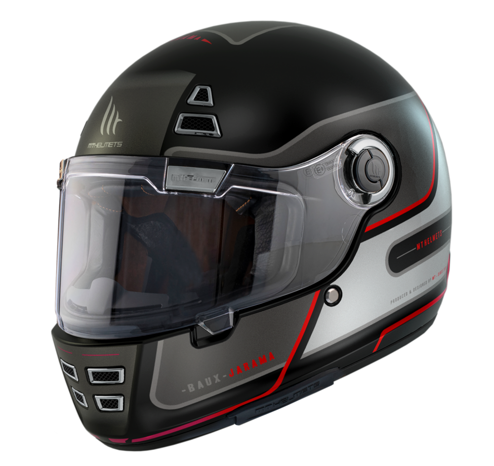 Casca integrala MT Jarama Baux E15 rosu fluor mat - model Retro - Cafe Racer Descriere: • originalul, updatat; • Jarama este o casca ce reprezinta istoria, traditia si experienta productiei de casti moto a producatorului MT Helmets; •dupa mai mult de 50 de ani de experienta, modelul Jarama este relansat pe piata, ca o versiune mult imbunatatita, pentru a aduce un tribut modelului Jarama produs de MT la inceputul anilor 1980; • modelul Jarama este primul model de casca retro, la nivel mondial, care a obtinut noua omologare ECE 22.06; • casca este omologata si DOT; • deviza acestui model: design retro, siguranta pentru viitor; • mecanism vizor: echipa R&D  a producatorului MT Helmets a proiectat un mecanism de viziera cu eliberare rapida a vizierei (Quick Release System); • designul exterior al castii a fost proiectat sa imbine estetica retro cu functionalitatea unei casti moderne, integrand ventilatii interioare, pentru o ventilare optima  a castii; • casca este echipata si cu chin guard (protectie la vant a barbiei); • interiorul pastreaza tema rretro a castii, fiind fabricat din materiale antialergice, ce pot fi demontate si spalate (interior detasabil). Caracteristici • fabricat din ABS (policarbonat cu rezistenta maxima la impact) - interior cu densitate multipla pentru o rezistenta crescuta la impact; • interior complet detasabil; • materiale antialergice; • casca ventilata in interior; • deflectorul pentru nas inclus in interiorul castii; • mecanism deschidere viziera pivotant; • calota interioara cu rezistenta mare la impact; • design clasic, old school; • permite montarea de lentila antiaburire Fog Off - tip lentila: FOG 012; • compatibila pentru montarea de Intercom (Bluetooth compatible) - pe aceasta casca pemite montare sistemelor de comunicare Bluetooth; • H. I. R. P. - High Impact Resistant Polymer - calota exterioara H. I. R. P. este fabricata dintr-o combinate de polymer care ofera o protectie ridicata in caz de impact; • marimi disponibile: XS-XXL; • greutate: 1400 +/- 50gr; • 2 calote disponibile: -- 1 calota pentru marimile XS, S, M; -- 1 calota pentru marimile L, XL, XXL. Caracteristici viziera: • simpla, clara, tratata antizgarieturi. Echipament optional: • viziera transparenta; • viziera neagra. Omologari: - ECE/ONU22.06; - DOT.