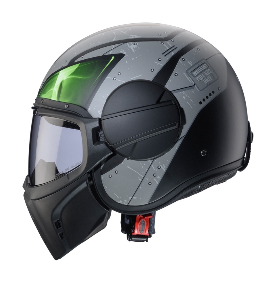 • casca jet (open-face) Ghost este, de fapt, echipata si cu ochelari (tip viziera) de protectie, precum si cu barbie care protejeaza de frig in lunile reci, precum si de praf si insecte;
