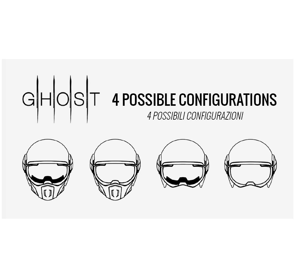 • Ghost se diferentiaza de celelalte casti open face de pe piata datorita vizierei, mandibulei si a benzii de burete dispuse in interiorul mandibulei, pentru o etansare superioara;