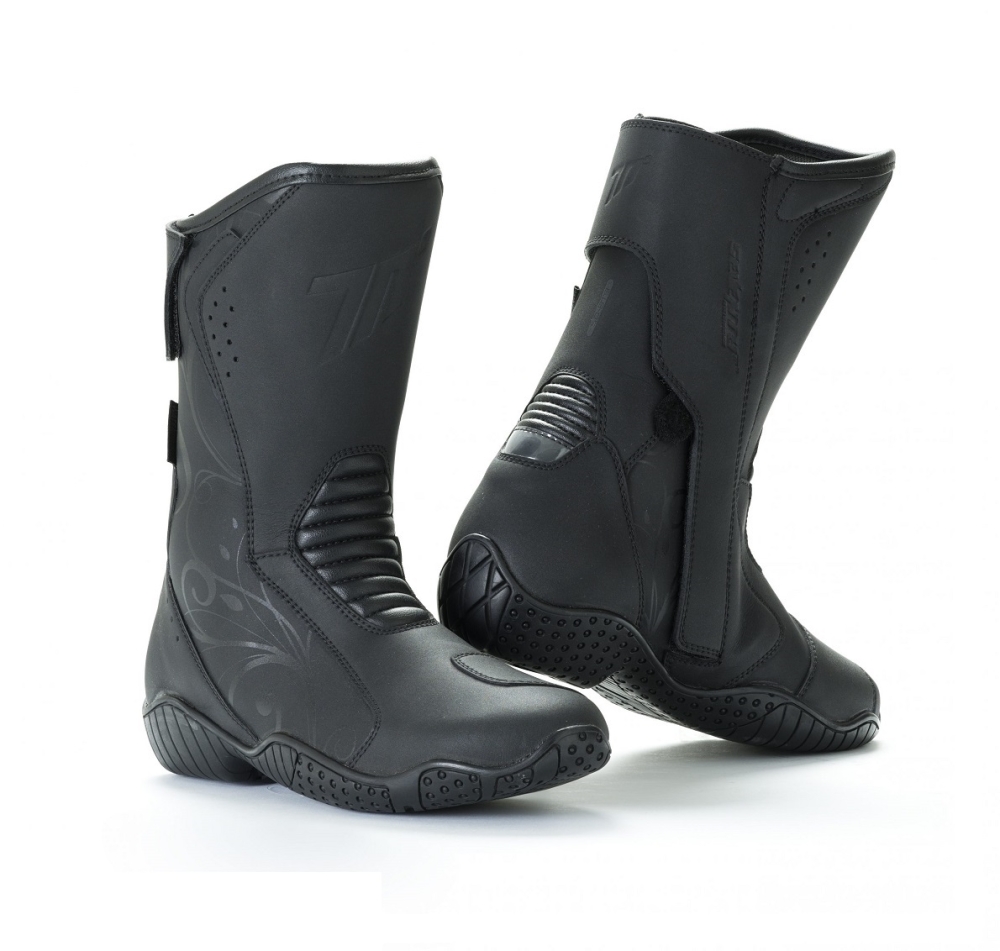 Ghete (cizme) moto Touring Femei Seventy model SD-BT9 culoare: negru Caracteristici: • culoare: negru; • marimi disponibile: 36-41; • utilizare: unisex; • ghete omologate: CE Approved: EN 13634:2017; • ghete inalte de Touring, fabricate din Nylon si piele; • contine membrane WinterTex rezistenta la apa (waterproof) si interior din polyester ce asigura ventilarea picioroului (breathable); • branturi inlocuibile; • fixarea ghetei: cu fermoar; • banda “double Velcro” si acoperire a fermoarului (cu scai); • elemente reflectorizante in spate si in laterale pentru a creste vizibilitatea; • talpa anti alunecare; • insertii pe partea frontala a ghetei, pentru a evita deteriorarea acesteia de catre maneta de schimbator; • ghete intarite la fluierul piciorului, calcai si degete; fixare optima a gleznei pentru protectie crescuta la accidentari. Compozitie: • exterior: – piele sintetica; – Nylon. • interior: – membrana “micro-breathable’ din polyester.