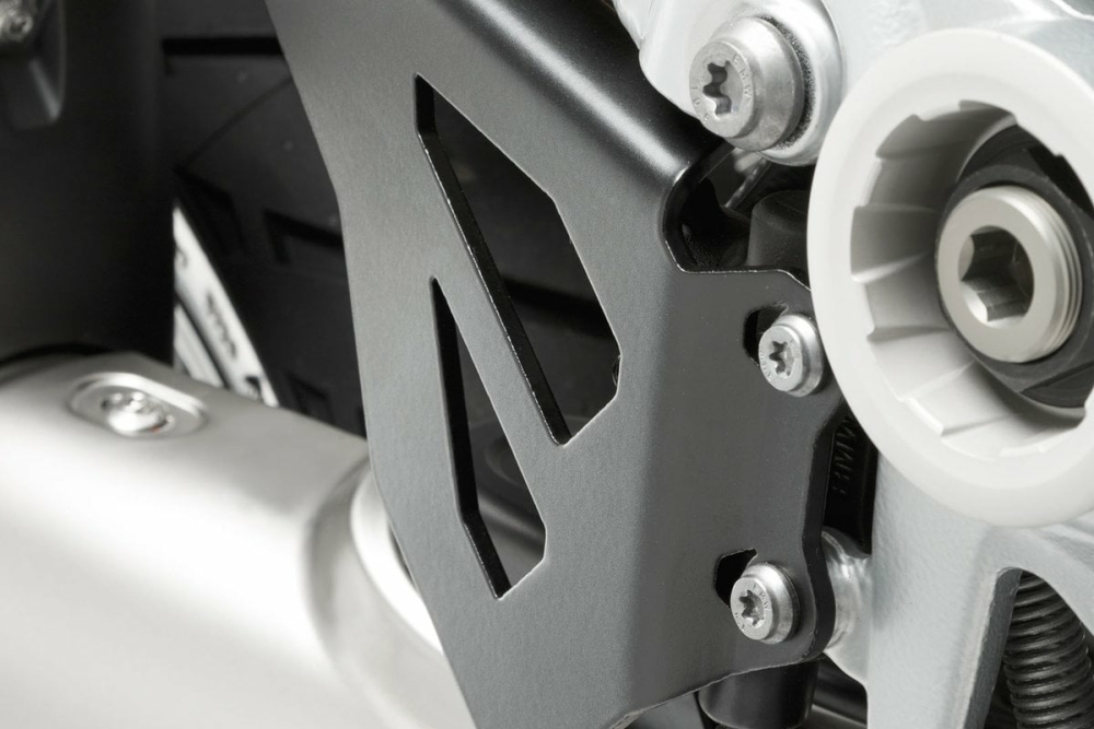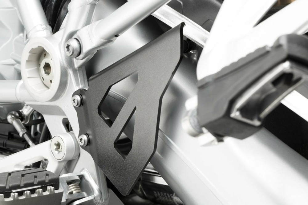 Brake-Pump Protection Consists of 1 Brake-Pump Protection plate for the right side and 1 mirrored protection plate for the left side (optics). Prevents contact between boot and foot brake cylinder and provides additional protection. Lasered and bended from high-strenght aluminum. Colour: Black, powder-coated. Included: 2 Protective plates Instructions Pentru a vizita produsul pe siteul producator click aici: www.sw-motech.com Negru. Für rechte linke Seite.