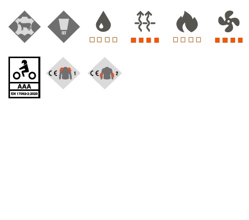 • intarituri cu materiale de calitate superioara la zonele expuse in caz de cazaturi (strat dublat de piele, mesa (mesh) 3D AIR Space + 600D), pentru siguranta si pentru o aerodinamica mai buna (piept, bicepsi, tricepsi, umeri si coapse);