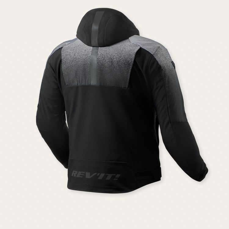 The upper region of the Epsilon H2O jacket is comprised of a jacquard woven fabric with an integrated gradient graphic. When we say integrated, the artwork is actually woven into the material itself, creating a beautiful visual effect that tapers seamlessly into the dark lower half. We also did something different with the hood – which is detachable. When affixed, the hood is held down by a magnetic fastener, which is then fused with laminated reflection. When the rider is wearing the hood, the lines of the lamination line up both on the hood and the jacket, creating a symmetrical vertical line.