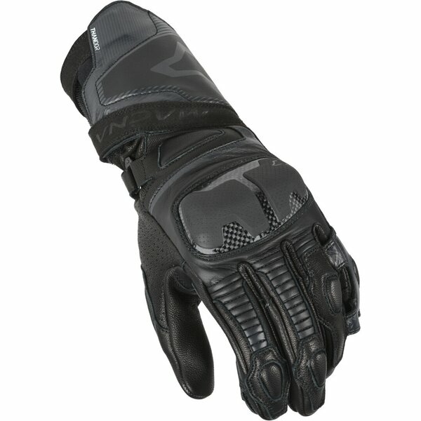 The Thandor motorcycle glove consists of high quality goat leather and cowhide, and the palm is reinforced with an extra layer to raise abrasion resistance. It is fitted with a tricot liner and the panel between the thumb and back of the hand is perforated to increase breathability. The absence of a waterproof membrane prevents you from sweating in warm riding conditions. A solid, preformed carbon protector is attached to the knuckles, which absorbs impacts and is abrasion-resistant. The palm features a hard, abrasion-resistant R.I.S.C.™ protector. At the palm, thumb, and back of the hand, Macna also added impact absorbent EVA padding. This glove features the Ergothumb™ construction, meaning the thumb and index finger are made of one and the same panel of fabric. This reduces seams and pressure points whilst also giving a wrinkle-free look. Thanks to the Touch Tip, you'll be able to operate touch screens without taking your gloves off. To enable as much freedom of movement as possible, the 30 Degree Buckle™ is fitted at the wrist. Through a Finger Bridge, the pinkie finger is fixed to the ring finger and well protected.