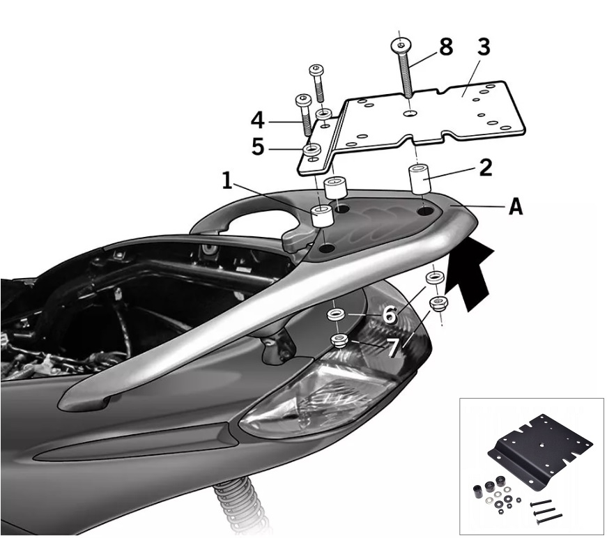 - sub acest cod se livreaza doar placa metalica + suruburile aferente, pe care se fixeaza gratarul de plastic al top case-ului + top case-ul;