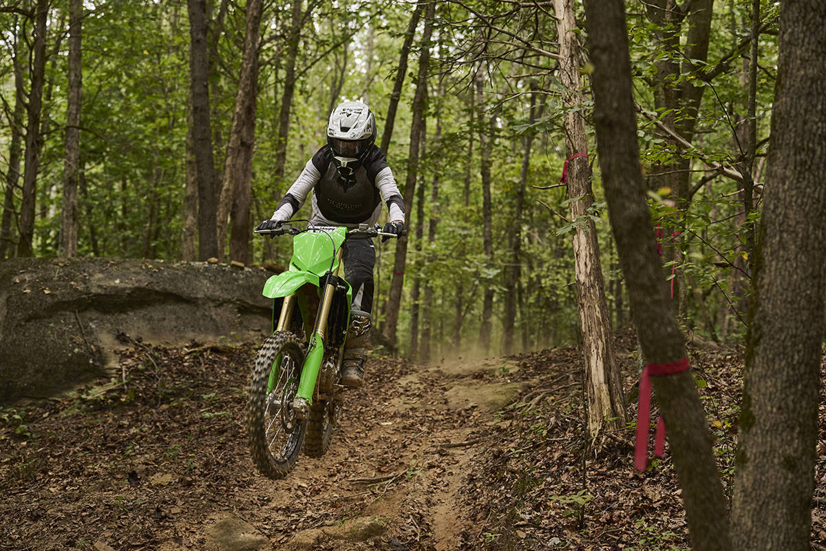 • Sistem suspensie spate Uni-Trak, reglabilă în interval dublu (viteză mică/mare) pe compresie, revenire și preîncăcare
