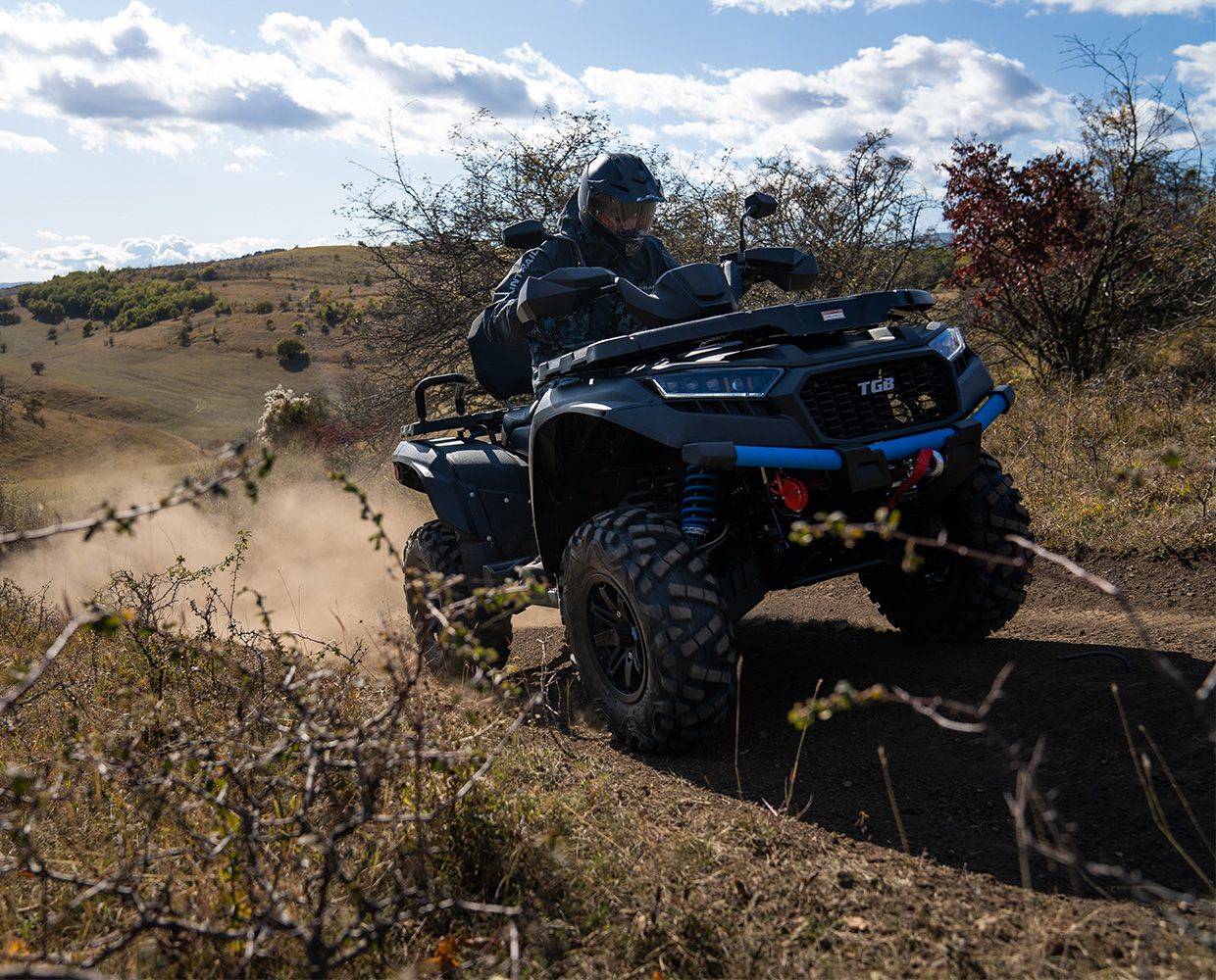 Dotări Cârlig de remorcare omologat, troliu electric de 1360 kg, apărători pentru mâini, bară de protecție față din oțel, suporturi pentru bagaje față/spate, scaun cu mânere și spătar pentru pasager, priză tip brichetă în consolă, elemente coloristice noi, faruri LED